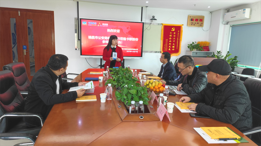 12月27日上午,江西瑞昌市公安局王政委領(lǐng)導(dǎo)一行蒞臨卡聯(lián)股份參觀考察交流,卡聯(lián)股份政務(wù)資源部總經(jīng)理廖嫦華女士等熱情接待并座談交流。